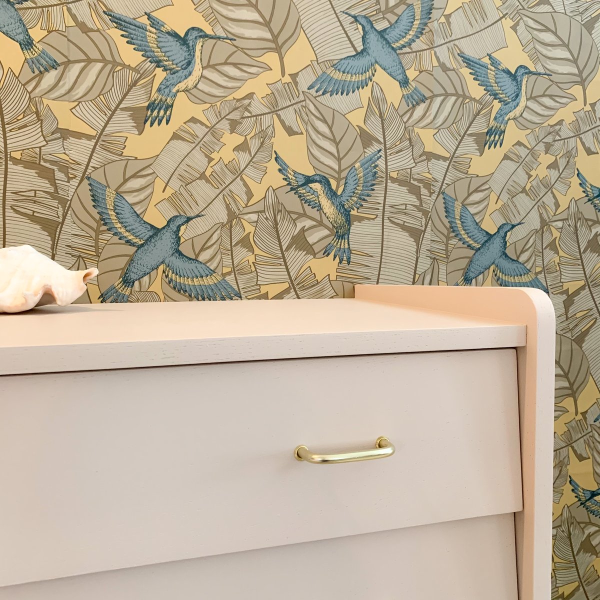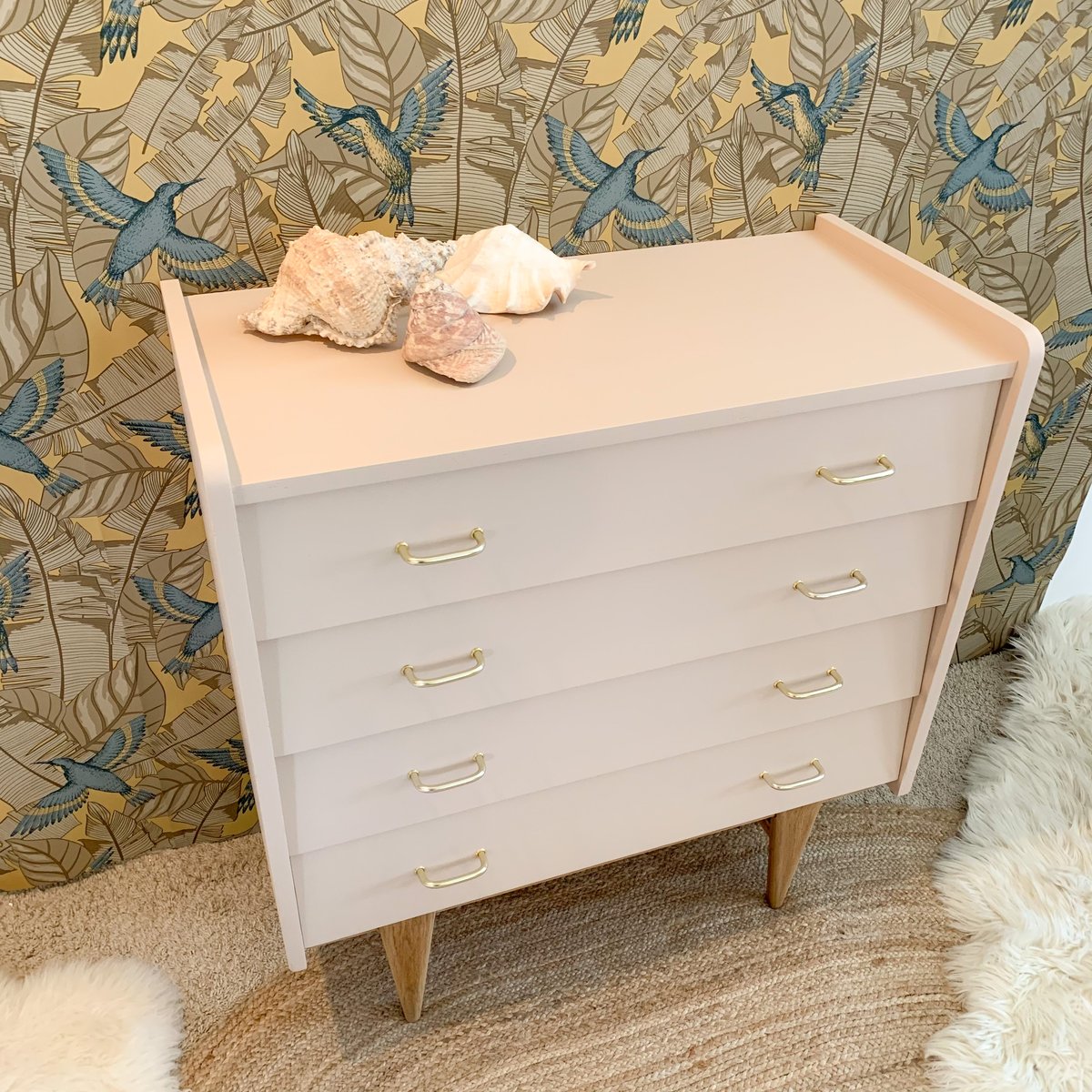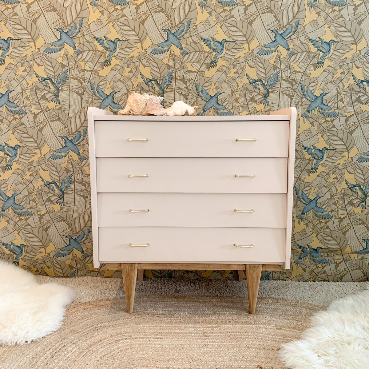 Sous le charme de notre commode aux beaux ailerons, bien dessinés, aux tiroirs inclinés et aux poignées dorées. Entièrement décapée et poncée de son vernis foncé et fatigué, elle a ensuite été peinte en rose poudre Setting Plaster. Le joli piétement laissé brut, pour jouer sur les contrastes bois naturel / bois peint, lui donne beaucoup d’allure. Bref, cette belle dame a du chien ;) Dotée de quatre tiroirs pour vos rangements, fond tapissé de notre papier peint acidulé. Poignées dorées d’origine, à peine patinées, nous avons juste remplacé les rondelles en laiton un peu fatiguées. En bel état, à noter seulement sur la tranche de l’aileron de droite, un manque de placage qui a été enduit sur le bas et laisse apparaître encore quelques aspérités de surface. Voir photo. Le décapage du piétement n’a pas permis également de venir complètement à bout du vernis d’origine marron foncé, et on le devine quelque peu dans le veinage du bois.