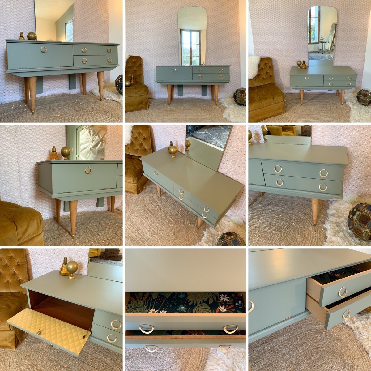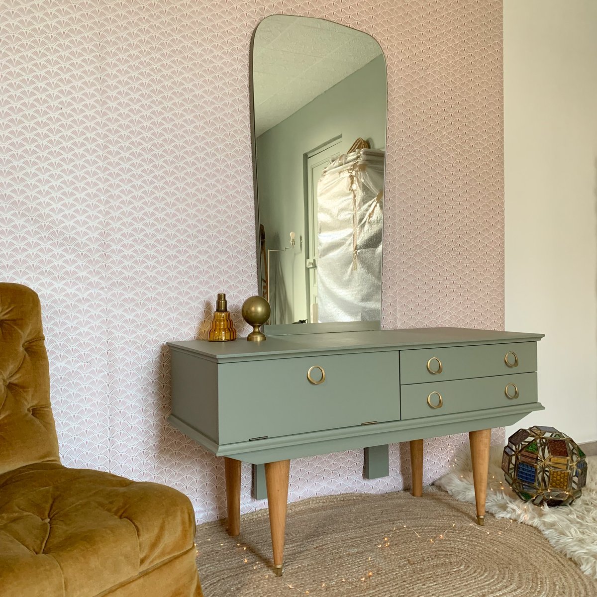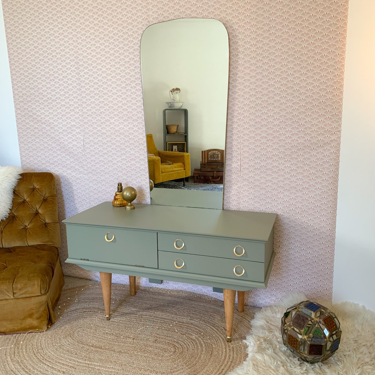 Mi console mi coiffeuse, on est sous le charme de cette jolie pièce rétro revisitée. Entièrement décapée de son épais vernis, puis poncée et enduite par endroits, nous avons choisi le vert tendre Treron pour mettre en valeur le contraste avec le doré patiné des poignées. Le magnifique miroir, sobre et élégant, donnera de la profondeur à votre intérieur et reste amovible pour ceux désireux de l'utiliser en console simple. Il se marie à merveille avec le look rétro de la console, twisté par de belles poignées originales. Les pieds fuseaux, à l’origine marron foncé, ont été vernis après ponçage pour protéger le bois blond. Joliment habillés à l’avant d’un délicat embout que nous avons re doré. Le bois des pieds reste très légèrement marqué par son vernis d’origine, voir photos. Deux tiroirs à droite, fond tapissé de papier peint, et un rangement à gauche fermé par une porte battante. En très bel état. Livrée démontée. À adopter pour habiller vos chambres, salons ou entrées d’une pièce vintage unique et rétro comme on aime.