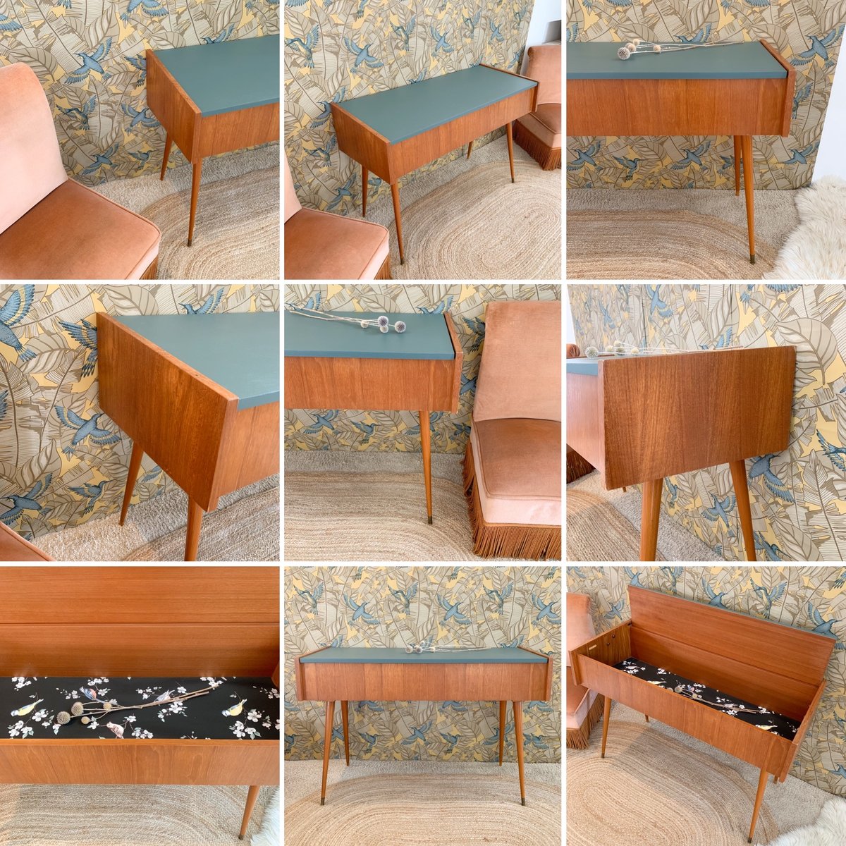 Anciennement utilisée comme meuble de machine à tricoter, on est fan de cette console (ou bureau d’appoint) détournée, avec ses longs pieds compas fins qui lui donnent tant d’allure ! Jolie ligne avec ses pans latéraux et horizontal légèrement inclinés. Les surfaces vernies ont eu le droit à un nettoyage au rénovateur de vernis Libéron afin de faire disparaître les rayures de surface. Le dessus quant à lui ayant un peu trop souffert a été poncé puis peint en bleu vert Inchyra Blue. Fond intérieur tapissé de papier peint. Les pieds avants sont habillés par un joli embout en laiton doré vieilli, qui devait certainement exister à l’origine également à l’arrière. L’ouverture du pan horizontal s’effectue en le soulevant puis en le glissant jusqu’à mi hauteur le long du dos du meuble. En très bon état général, quelques petits éclats de placage à noter sur les côtés, voir photos. Les pieds se dévissent pour le transport !